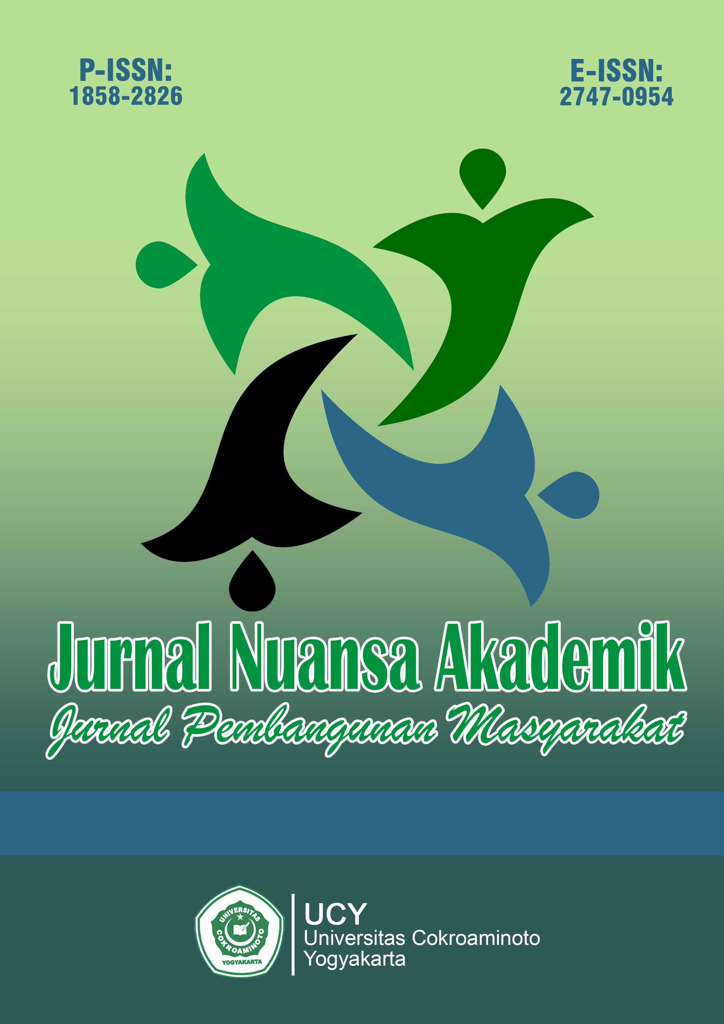 Jurnal Nuansa Akademik: Jurnal Pembangunan Masyarakat (JNAJPM); p-ISSN: 1858-2826 & e-ISSN: 2747-0954; is a scientific interdisciplinary journal in the national level published by Lembaga Dakwah dan Pembangunan Masyarakat Universitas Cokroaminoto Yogyakarta (LDPM UCY). Moreover, The aim of this journal is disseminate the conceptual thoughts and research results from academicians, researchers, practitioners or students to explore ways of improving standards of living, and potentially modifiable characteristics of both social and physical environments at the individual, household, and community levels to a more developed society. Including servicing and empowering, developing society covers a lot of theoretic and empiric issues related to religion & culture, science & mathematic, education & training, law & administration, economic & entrepreneurship, environmental & civil engineering. Go to Login or Register