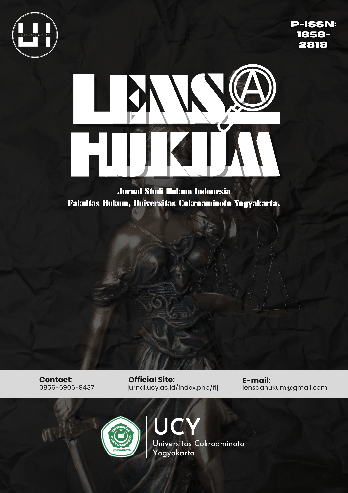 Lensa Hukum is the first academic journal published by the Faculty of Law, Universitas Cokroaminoto Yogyakarta (UCY). Carrying the foundation as the first journal ever published within the faculty, the current editorial team is dedicated to uphold tradition while bringing a renewed spirit and fresh perspective, committed to maintain its relevance amidst the dynamic and inticrate landscape of legal research development. Jurnal Lensa Hukum (JLH) P-ISSN 1858-2818 provides a medium for scholars, practitioners, lecturers, and students, both from Indonesia and abroad, to share their insights within the field of Indonesian legal studies in particular, while still welcoming the exploration of broader global legal issues in general. Ultimately, JLH's primary aim is to advance and enrich the realm of legal research and fostering critical discourse for the growth of Indonesian legal studies.