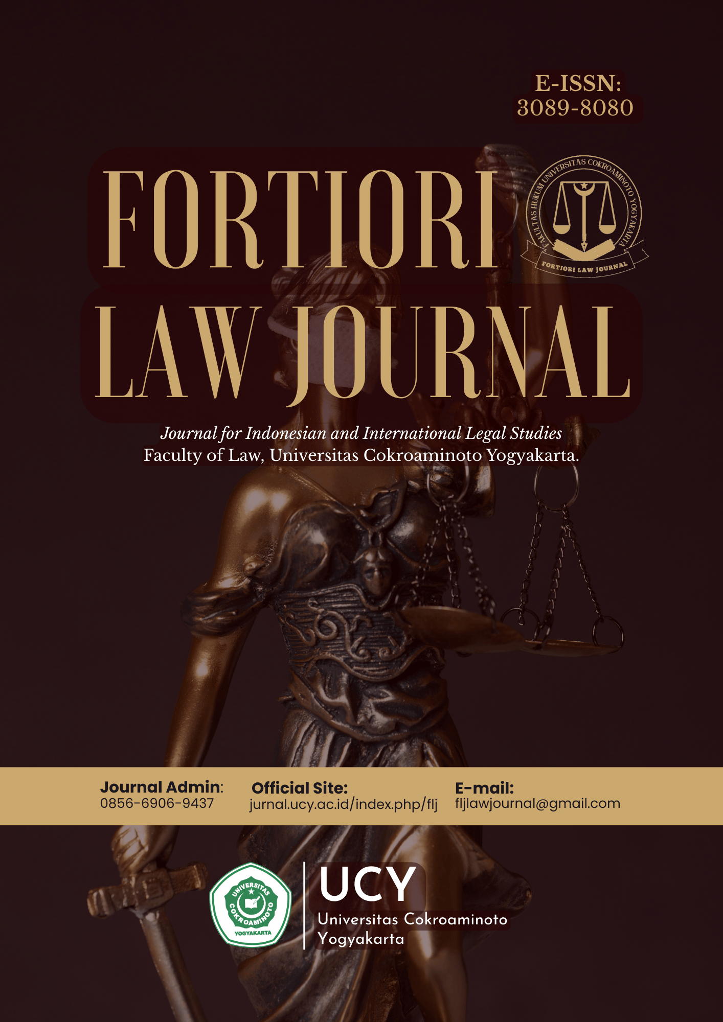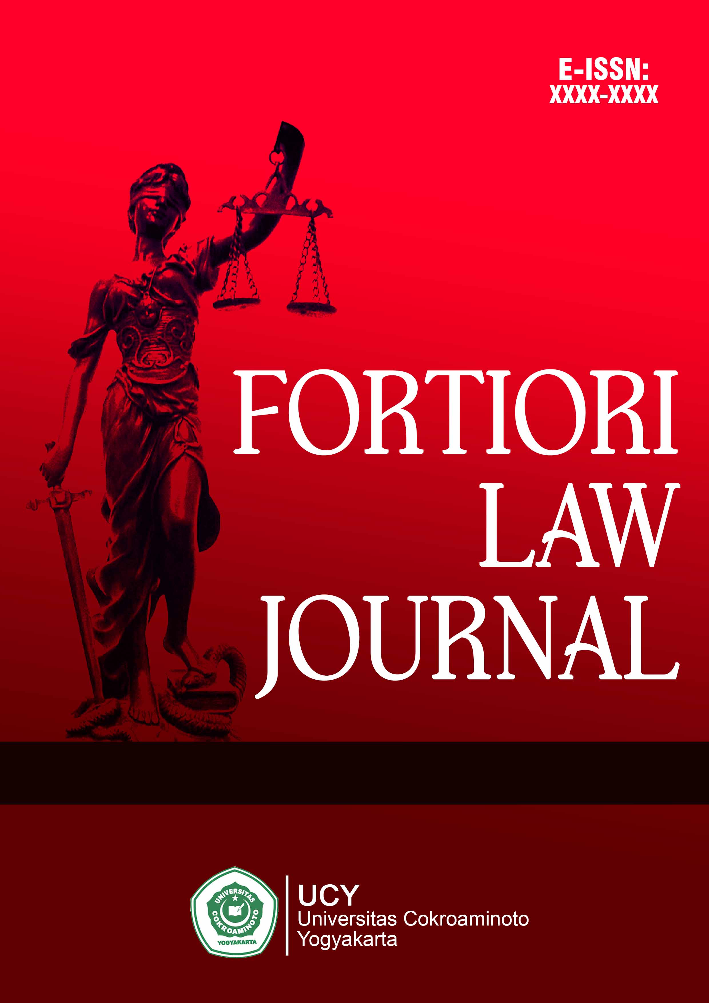 Fortiori Law Journal (FLJ) E-ISSN 3089-8080 is a distinguished law journal published by the Faculty of Law, Universitas Cokroaminoto Yogyakarta (UCY), first launched in January 2021. The name "Fortiori" is derived from the legal term "a fortiori," which signifies an argument that holds even greater strength. In Latin, "a fortiori" literally translates to "from the stronger," reflecting FLJ's commitment to publishing robust and compelling academic findings across various fields of legal study. FLJ seeks to provide a platform for rigorous academic discourse, offering insights and analyses that resonate with both national and international legal communities. The journal welcomes contributions from diverse legal fields, aiming to enrich the understanding and application of law through scholarly works of the highest calibre.